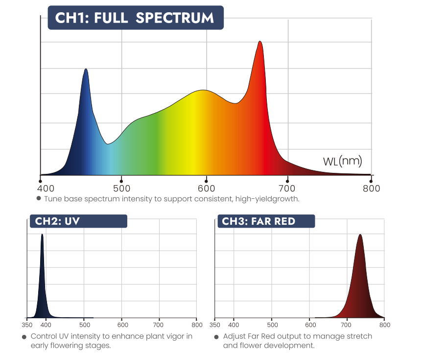 The Full Spectrum (FS) channel provides the core light source necessary for efficient photosynthesis, nutrient accumulation, and overall healthy plant growth. It ensures a stable and balanced light environment that supports the smooth transition from vegetative to flowering stages. The FS light simulates natural sunlight, providing plants with the necessary wavelengths of blue, red, and white light that encourage robust growth, improved chlorophyll production, and stronger root systems.